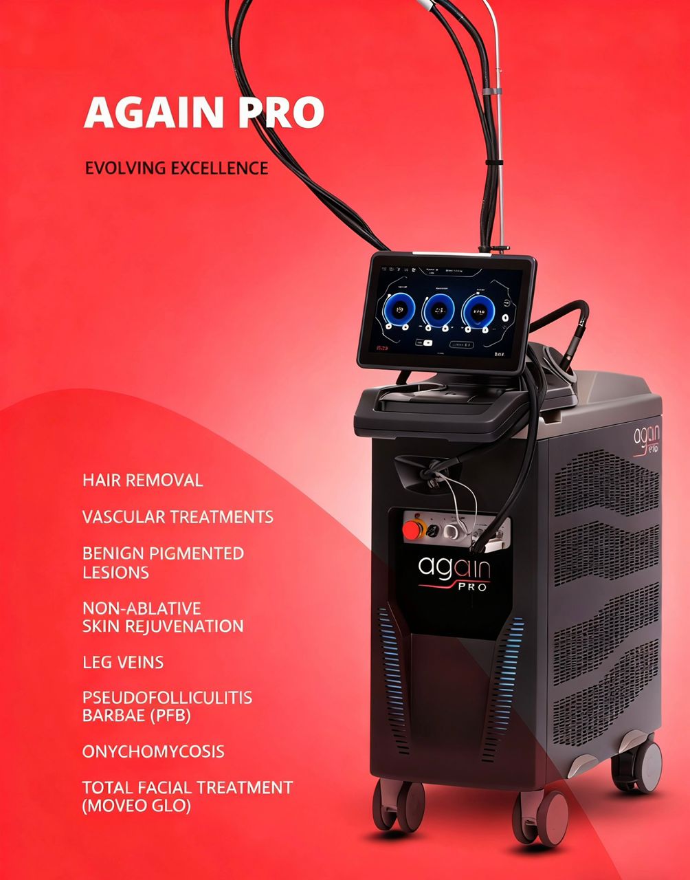 Again PRO delivers reduced treatment times with the ability to perform full body hair removal in less than 30 minutes. With a 30mm spot size, high peak power and stronger cooling strength, Again PRO delivers speedy, effective and virtually pain-free treatments for hair removal, vascular lesions, pigmentation, skin tightening and more.